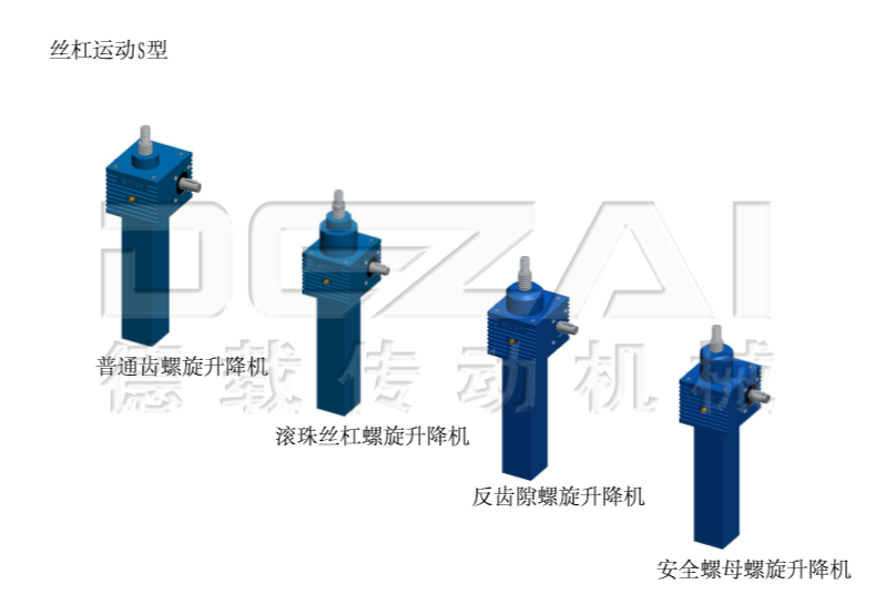 德載傳動絲桿升降機在絲桿類型中可分為兩種:1梯形絲桿升降機,2滾珠絲桿升降機。